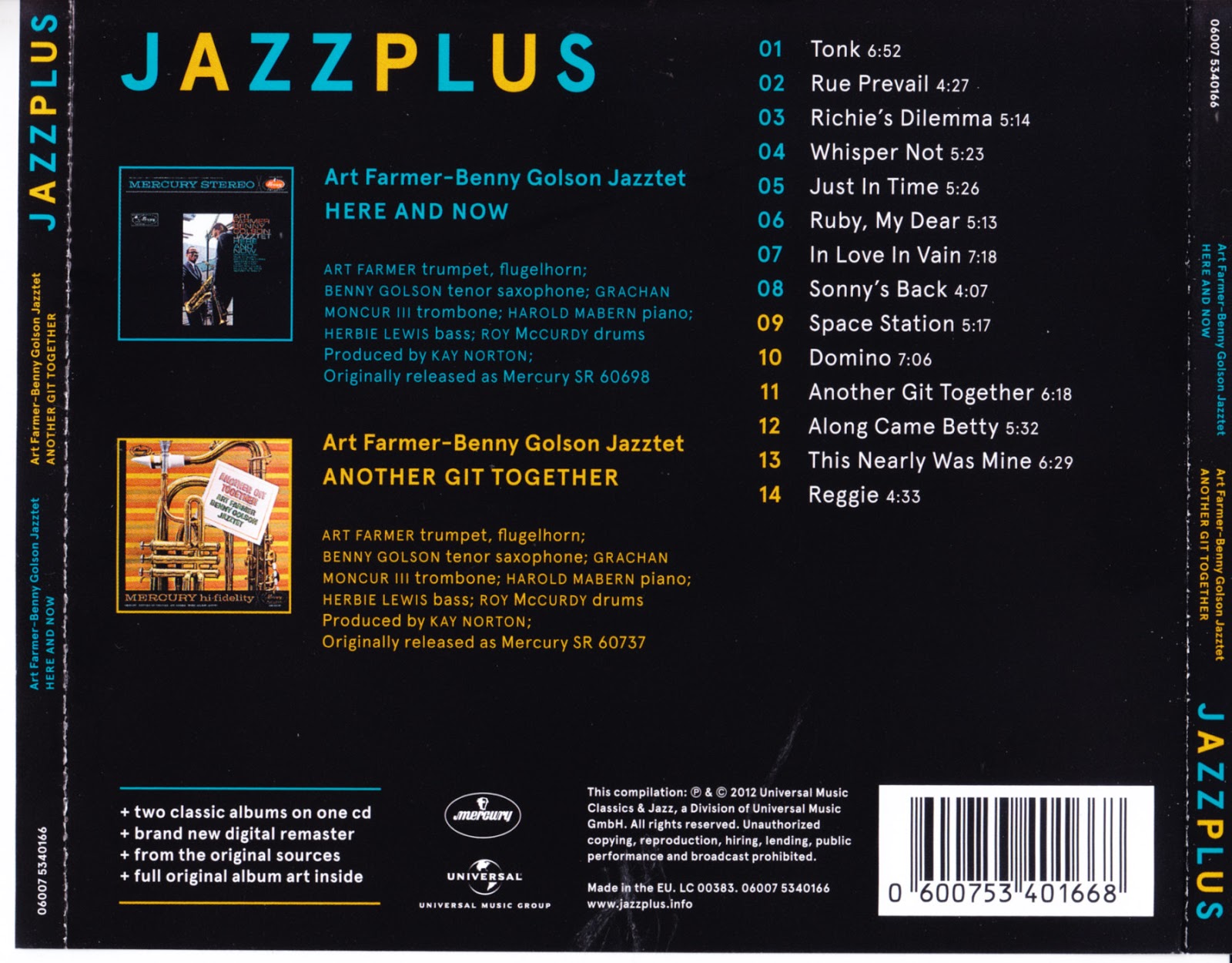 El Jazztet de Art Farmer y Benny Golson ya existía desde dos años antes cuando grabaron lo que serían sus Lp's finales, Here and Now y Another Git Together. El personal, aparte de los dos co-líderes, Art Farmer y Benny Golson, había cambiado por completo desde 1960, pero el sonido del grupo era el mismo. La versión de 1962 del Jazztet incluía al trombonista Grachan Moncur III, al pianista Harold Mabern, al bajista Herbie Lewis y al baterista Roy McCurdy. Es notable pensar que este grupo lleno de talentos, por alguna razón, no fue preparado para grabar aún más álbumes juntos. Los aspectos más destacados de este excelente Lp agotado incluyen "Tonk" de Ray Bryant, "Whisper Not", "Just in Time" y "Ruby My Dear" de Thelonious Monk. Un clásico grupo de hard bop, aunque de corta duración. Y es este el problema original ya que no incluye pistas extras.